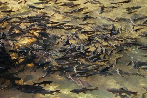 Smaller and faster than whales. They surface briefly and move quickly along current lines — easy to miss if you're not watching.